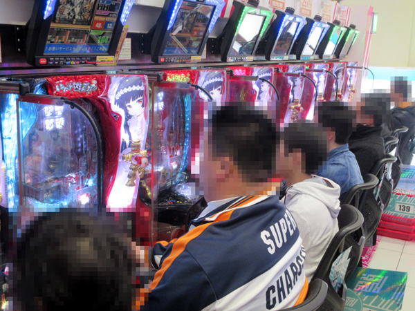 14時を過ぎた頃の1000円/47枚パチスロでは、「バジリスク~甲賀忍法帖~絆」や「SLOT魔法少女まどか☆マギカ」、「押忍!番長3」に加えて、ミリオンゴッドシリーズ、「ハナビ」や「バーサス」などのボーナスタイプの盛り上がりもピークに。満足そうな表情で遊技するプレイヤーがあちこちで見られ、華やかな光景が広がっていた。
