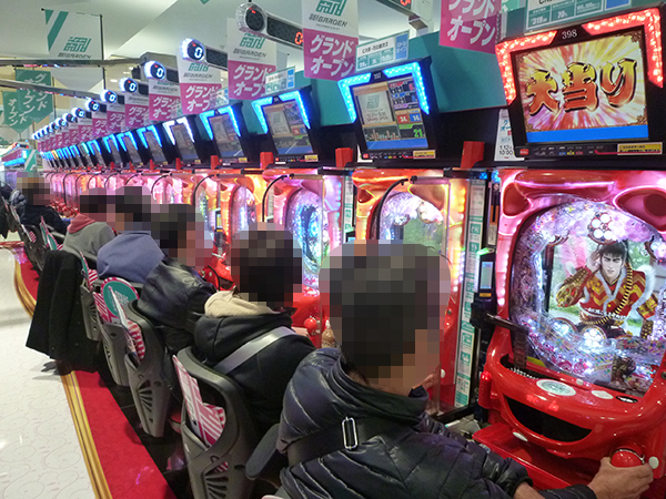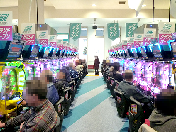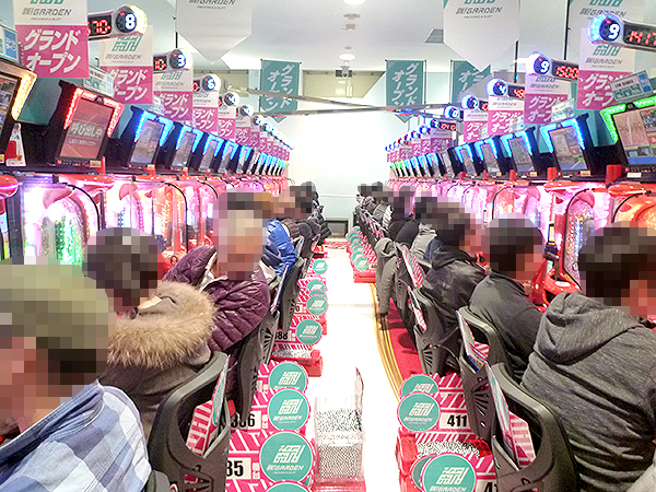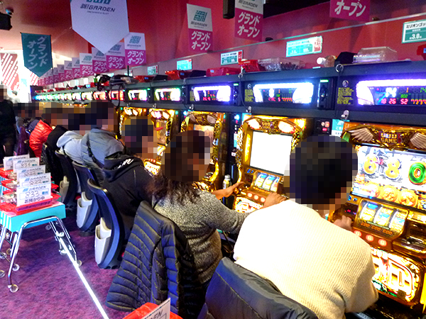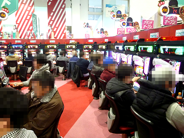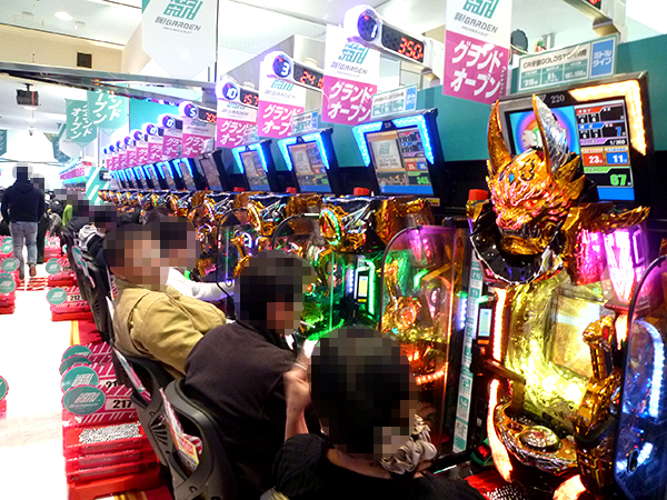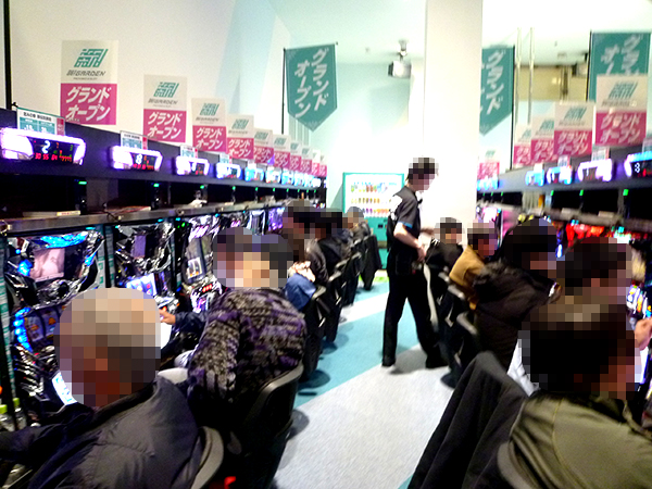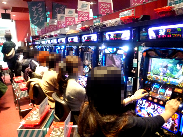 開店直後の4円パチンココーナーを見ると、「CR真・花の慶次2」が大人気。フロア一帯に広がる華やかな光景は、強く印象に残るほどであった。