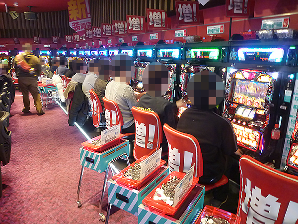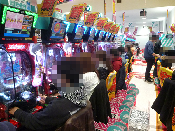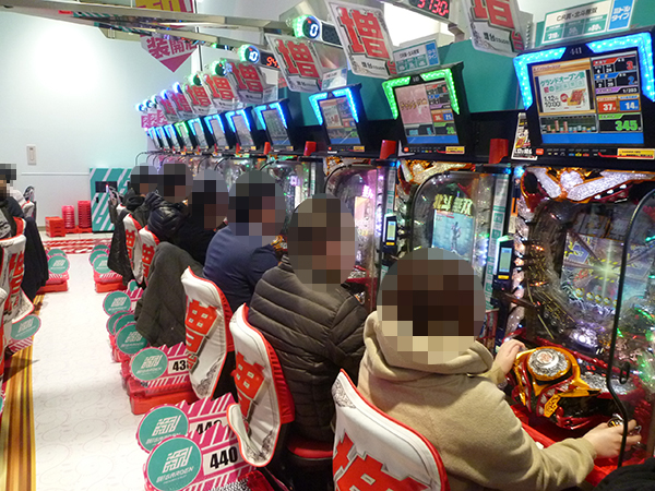 「ぱちんこCR真・北斗無双」や海物語シリーズのシマにも多数のプレイヤーが集まり、にぎやかな状況。