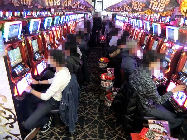 午後の20円パチスロでは、朝から好調だった「バジリスク~甲賀忍法帖~絆」「SLOT魔法少女まどか☆マギカ」に加えて、ミリオンゴッドシリーズや「パチスロ聖闘士星矢 海皇覚醒」といったAT・ART機が大盛況。