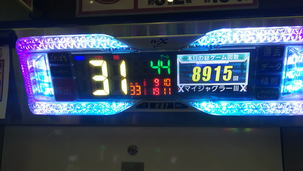 序盤こそ投資が増えたものの、「マイジャグラーⅢ」でのボーナス獲得は順調。