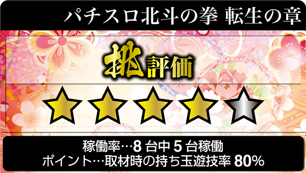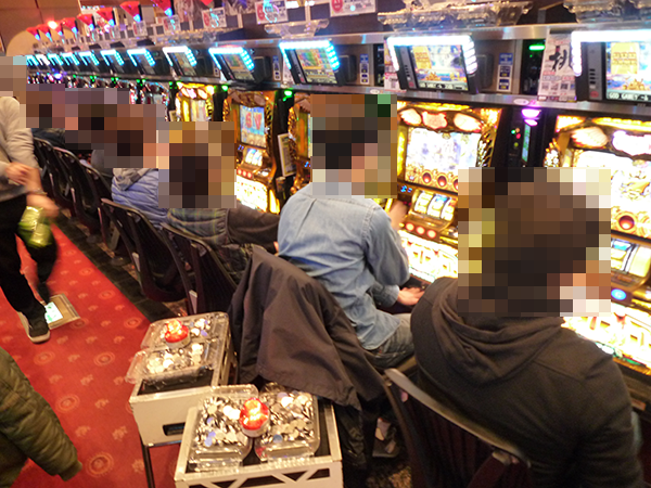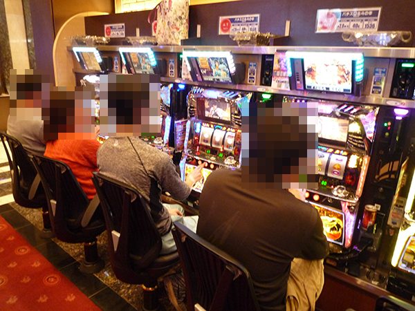 「パチスロ北斗の拳 転生の章」で遊技を楽しむプレイヤーたちも充実した面持ち。横一列に笑顔が並んで咲き誇っている光景は、調査のなかでもとくに印象に残っている。