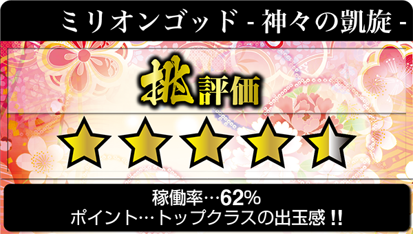 16時頃のホール内で、キラキラと輝いてみえたのは「ミリオンゴッド-神々の凱旋-」!! シマ全体から感じられる活気の大きさはこの日の主役といっても過言ではないだろう。