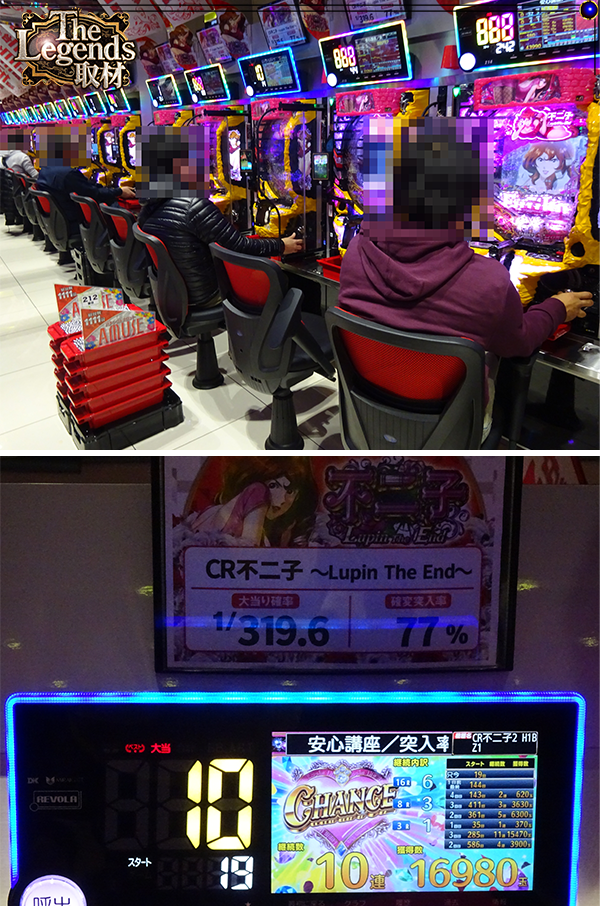 開店直後のパチンココーナーでは満席となっている機種が続出しており、にぎやかな状況。見事な連携でプレイヤーたちをサポートしていたスタッフたちの活躍も素晴らしかった。
