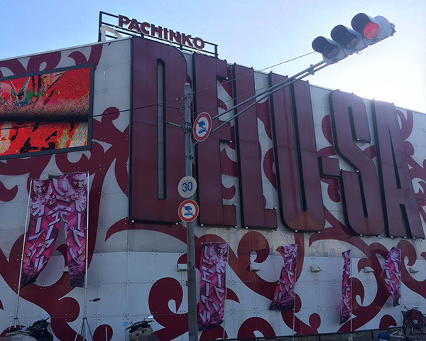 舞台となったのは、おしゃれな柄の模様と大きな看板が特徴的な「デルーサマックス西成本店」。