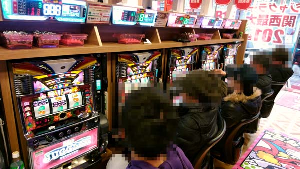 関西最大の設置台数を誇るジャグラーシリーズも大盛況。様々な機種からプレイヤーの輝くような笑顔を確認している。