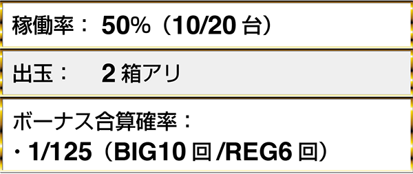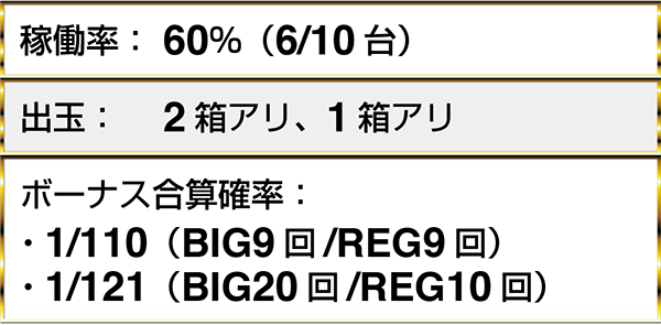 『マイジャグラーⅢ』や『ゴーゴージャグラー』においては、ボーナス合算確率1/130以下のデータも3台以上で確認している。