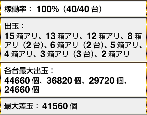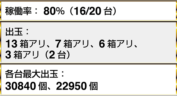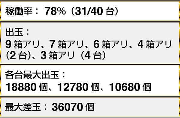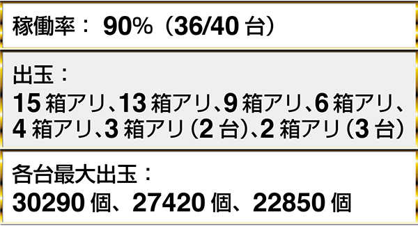 高稼働となっていた『ぱちんこCR真・北斗無双』と『ぱちんこCR北斗の拳7 転生』では5名以上のプレイヤーが10箱以上を獲得しており、40000個を超える最大獲得出玉も確認した。