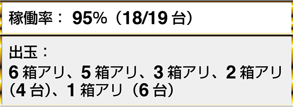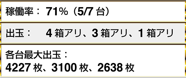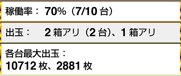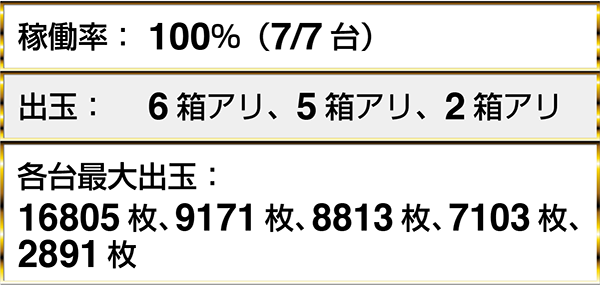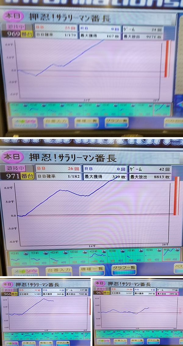 満席となっていた『押忍!サラリーマン番長』にて、取材時のトップクラスとなる10000枚超の出玉を確認した。