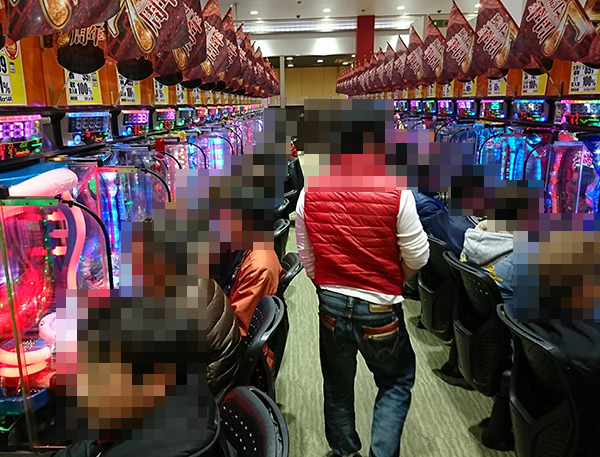 ホール内の様子をうかがうと、すみずみまで笑顔が咲き誇っている状況。パチンコとパチスロがどちらも支持を集めており、全体でみても80%以上の席が埋まっていた。