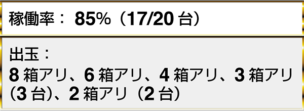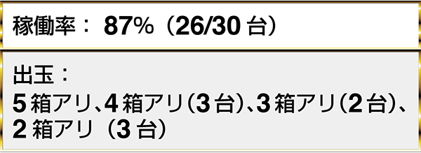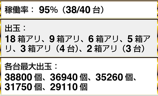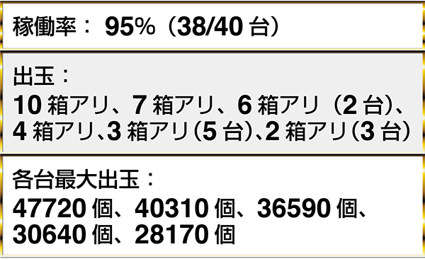 稼働率が95%であった大人気の『ぱちんこCR真・北斗無双』と『CR大海物語4』だけをみても、24名以上のプレイヤーが2箱以上の出玉を獲得していた。