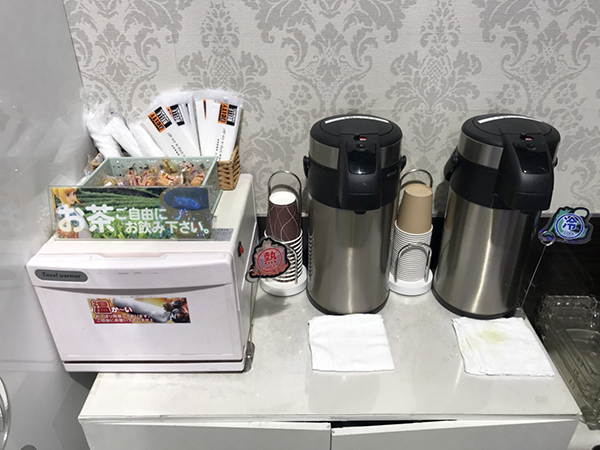 同店はプレイヤーが自由に飲めるお茶や、温・冷両方のおしぼりが用意されており、サービス面が充実している。