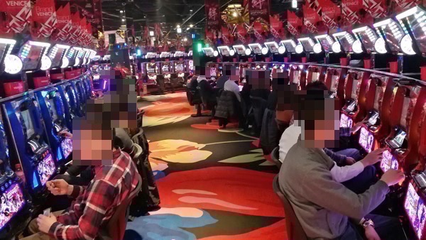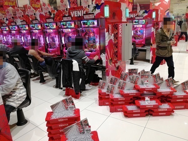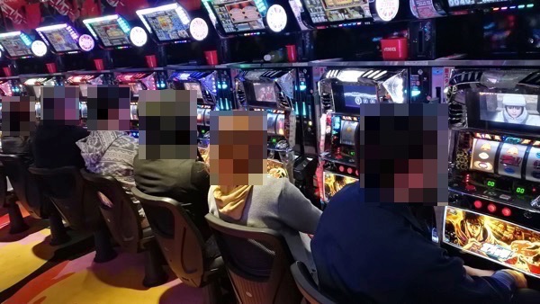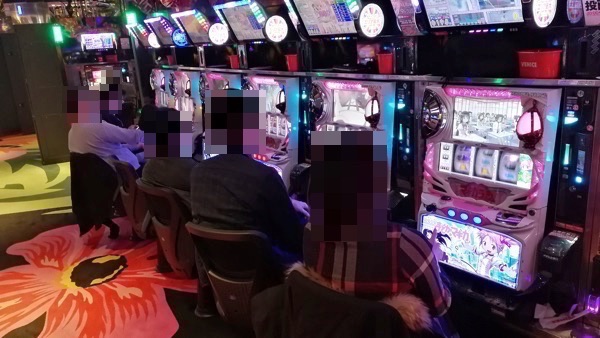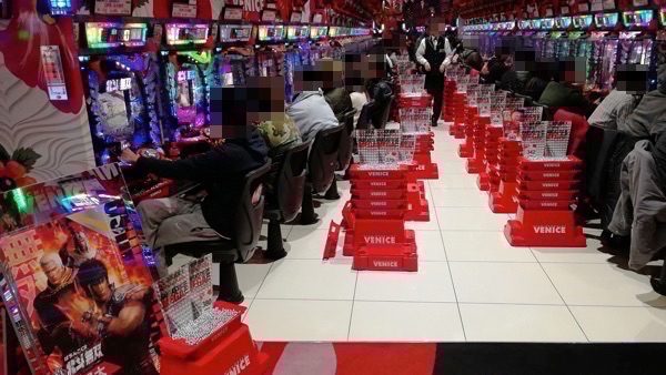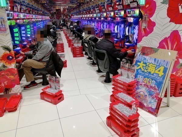 14時を過ぎた頃の4円パチンコでは、「ぱちんこCR真・北斗無双」が大盛況。満台となっているだけでなく、機種の性能を最大限まで引き出しているようなプレイヤーが多数存在。シマ一帯には、誰もが羨むほどの鮮やかな光景が広がっていた。