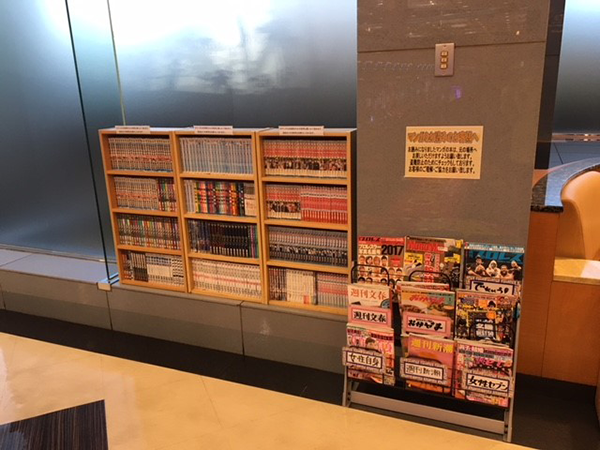 休憩スペースの居心地もよく、漫画や雑誌を読みつつくつろげる空間となっている。遊技の様子がみえる位置に設けられているため、空き台を待つ時間などにも重宝されるように思えた。