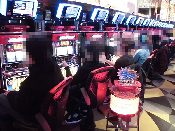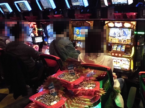 16時頃のパチスロをみると、「ミリオンゴッド-神々の凱旋-」や「押忍!番長3」、「バジリスク~甲賀忍法帖~絆」が大盛況。プレイヤーのイキイキとした表情からは、満足度の高さが伝わってきた。