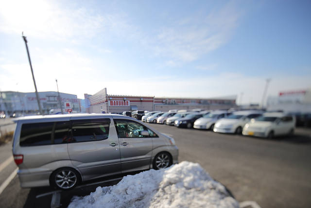 数日前に降った雪が残る駐車場。凍える寒さの中でも、ファンの車でパンパンに埋め尽くされる・・・