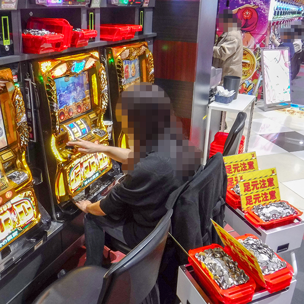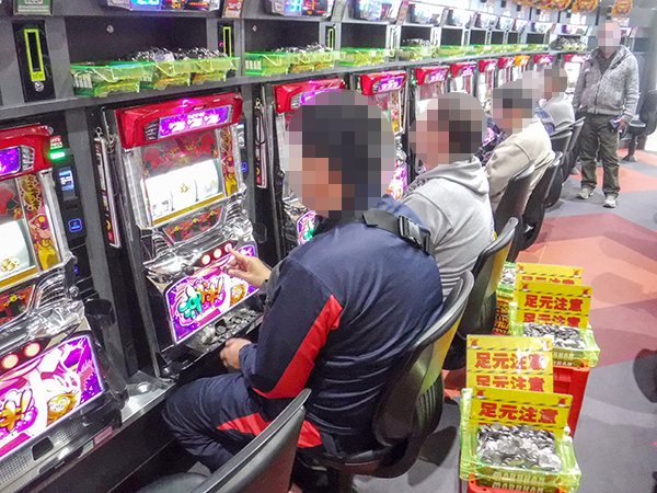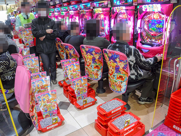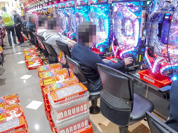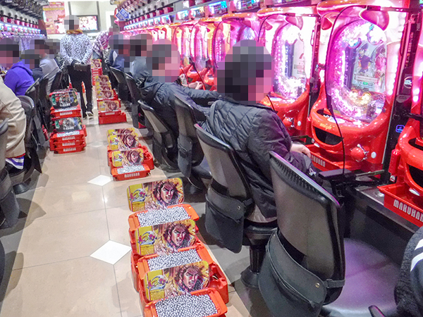 取材時には既に多くのプレイヤーが集結。パチンコ・パチスロを問わずにぎやかなシーンが展開していた。
