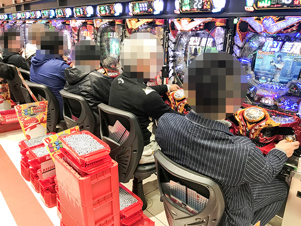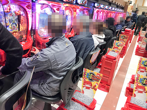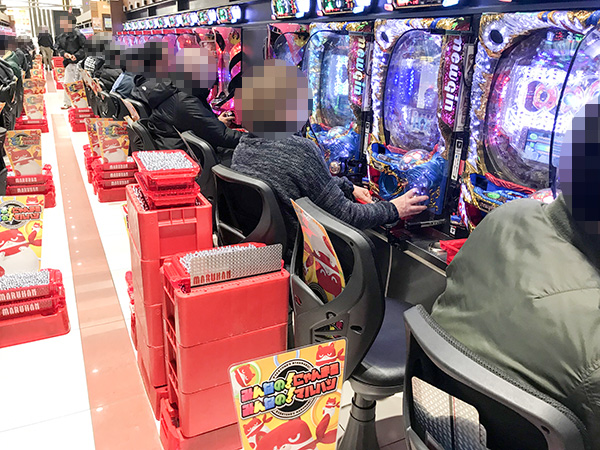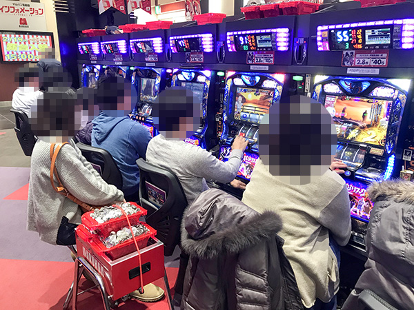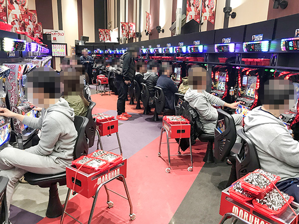 取材時、既に多くのプレイヤーが店内に集結。パチンコ・パチスロを問わずにぎやかな雰囲気だった。