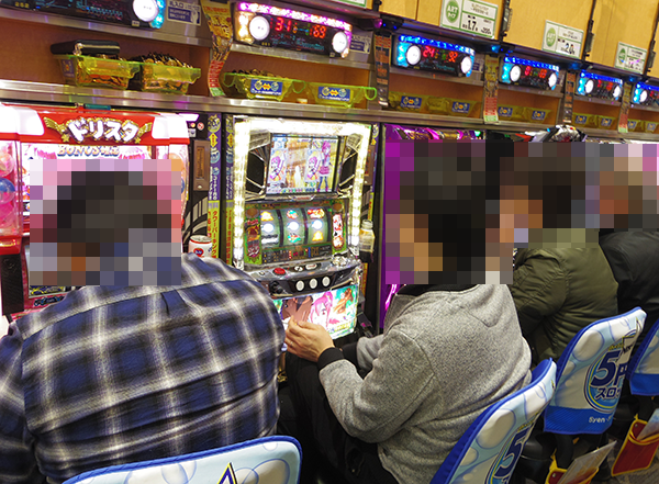 16時頃の20円パチスロで、とくに盛り上がっていたのが「バジリスク~甲賀忍法帖~絆」と「沖ドキ!」。プレイヤーたちは機種の特徴を活かし、充実感を得られている様子であった。