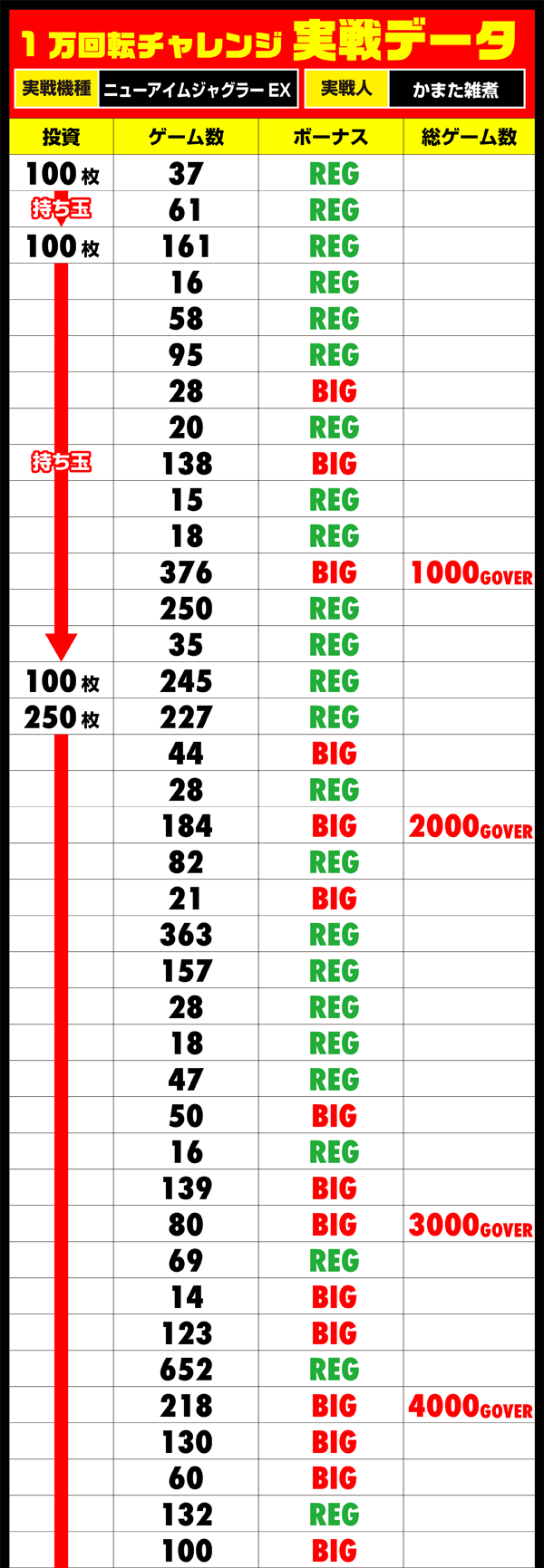 「ニューアイムジャグラーEX」を舞台に開始したチャレンジは、序盤からREGに大きくかたより、一気に加速できる展開。