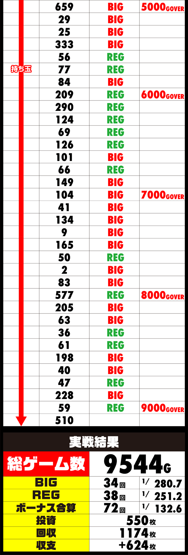 中盤以降に600G以上のハマりが2回あり、持ち玉を減らすもプラスの差枚は維持。