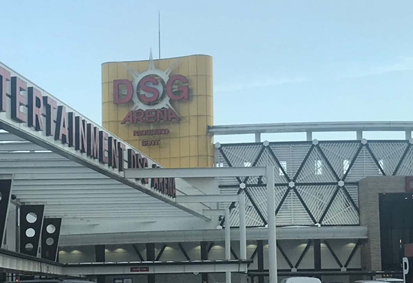 「真双龍」の舞台となったのは、白い外壁に黄色の看板が特徴的な外観の「DSGアリーナ」。