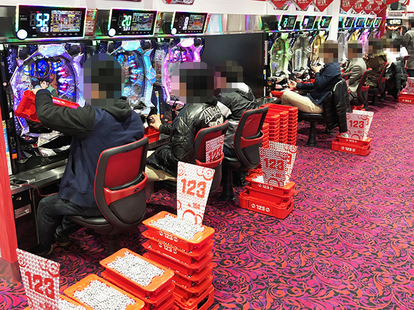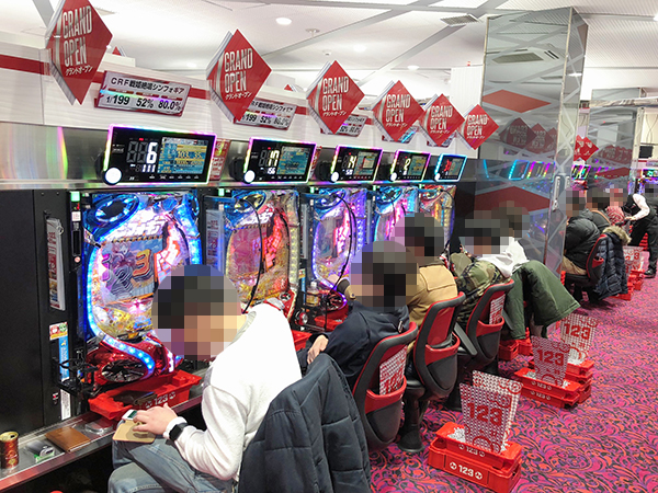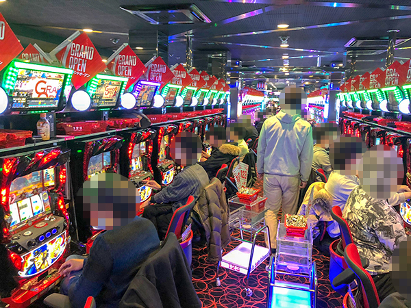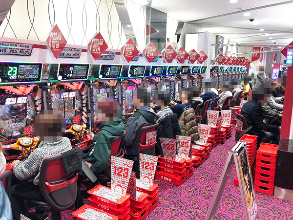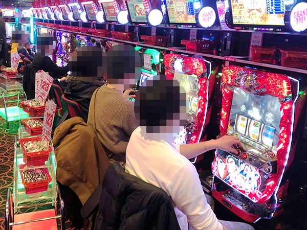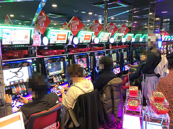取材時、店内には既に多くのプレイヤーが集結し、パチンコ・パチスロを問わずにぎやかな雰囲気が感じられた。