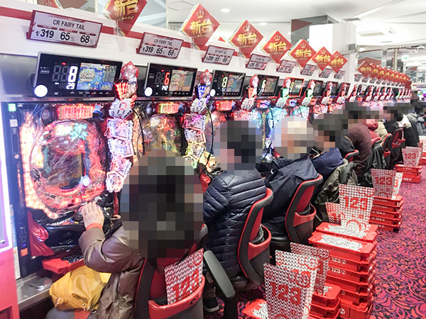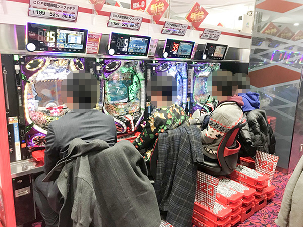 15時半過ぎの4円パチンコを見ると、新台の「CR FAIRY TAIL FPM」や「ぱちんこCR真・北斗無双」、「CR真・花の慶次2」などが大盛況。機種の魅力を存分に味わいつつ、笑みを浮かべるプレイヤーたちを目にしている。
