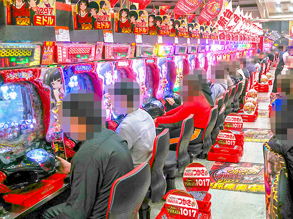 同店はパチンコ683台・パチスロ334台、合わせて1017台を設置するメガホール。取材時も多くのプレイヤーでにぎわっていた。