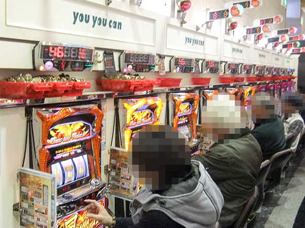 5円パチスロを見てみると、「沖ドキ!-30」や「ハナハナ鳳凰-30」、「ニューキングハナハナ-30」など、沖スロの盛り上がりが大きい。そこかしこに華やかな光景が広がり、それぞれ納得の遊技ができているようだった。