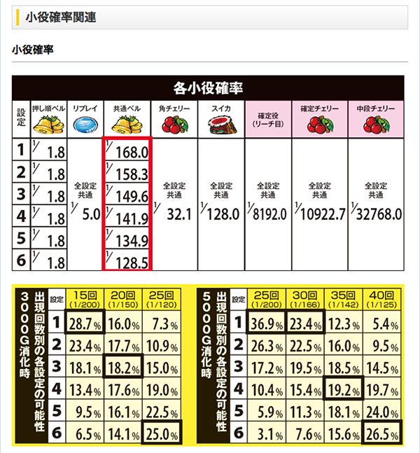 どの状態でもカウントできる共通ベル確率に設定差が存在。サンプルを集めて設定推測の精度を高めよう。