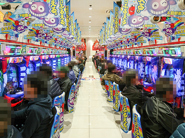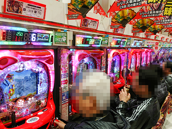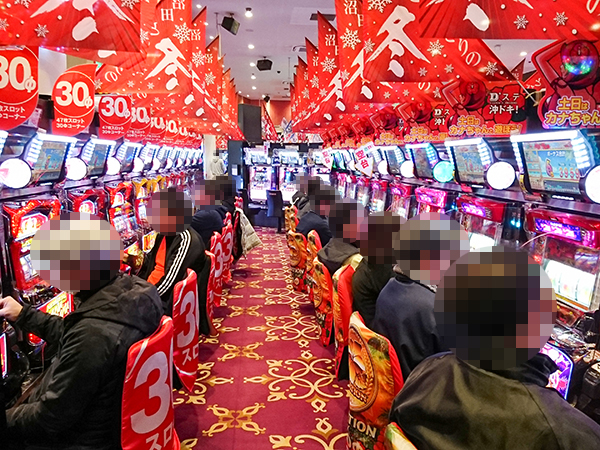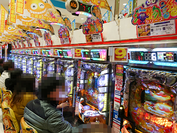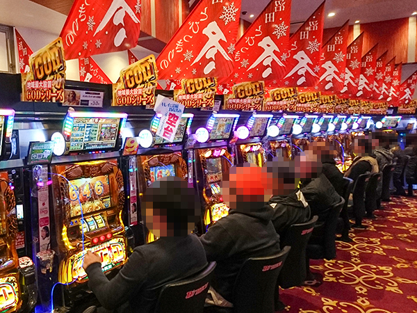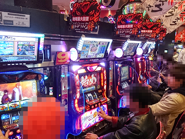取材時の店内は大勢のプレイヤーが集合。パチンコ・パチスロ共に盛り上がりを見せていた。