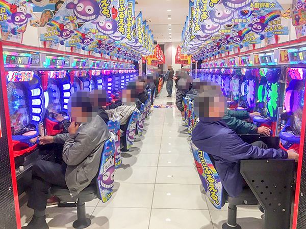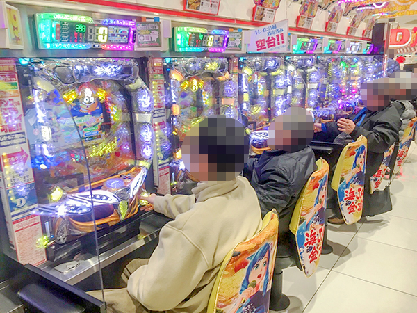 14時過ぎの4円パチンコでは、海物語シリーズがひときわ盛況。「CR大海物語4」や「CRスーパー海物語IN JAPAN 金富士バージョン 319バージョン」など、大勢のプレイヤーが見事なパフォーマンスを披露していた。