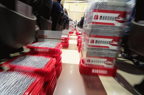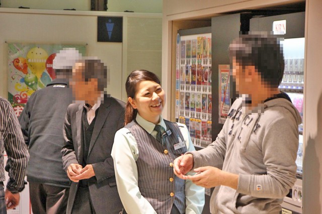 | ファンは休憩を取っていたり、中央通路・休憩コーナーで友人・知人同志で話し込んでいたりと和やかな雰囲気に。スタッフとの笑顔を交わすファンも多くなる時間帯だ。1日目は、この時間に記念品のボックスティッシュも配布していた。 | |