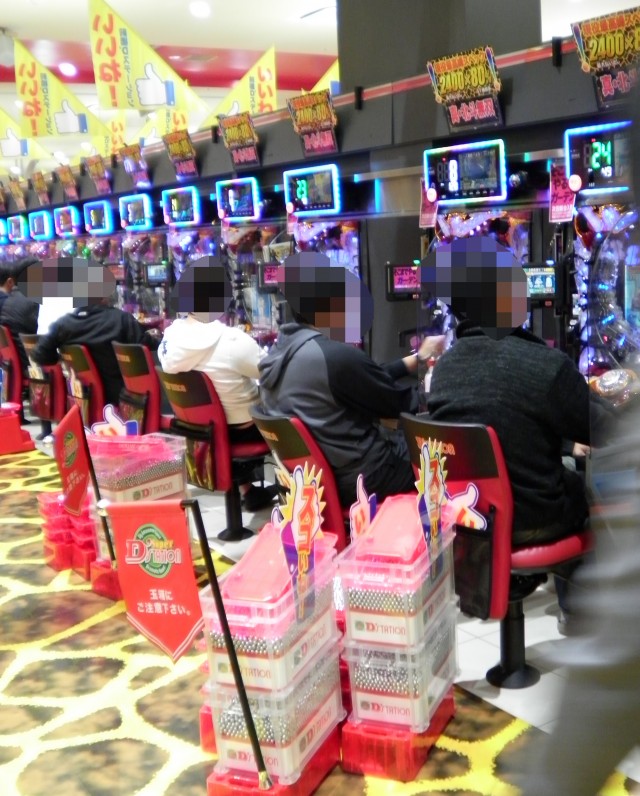 ドル箱が打ち手の腰の高さくらいまで積まれている台が点在。