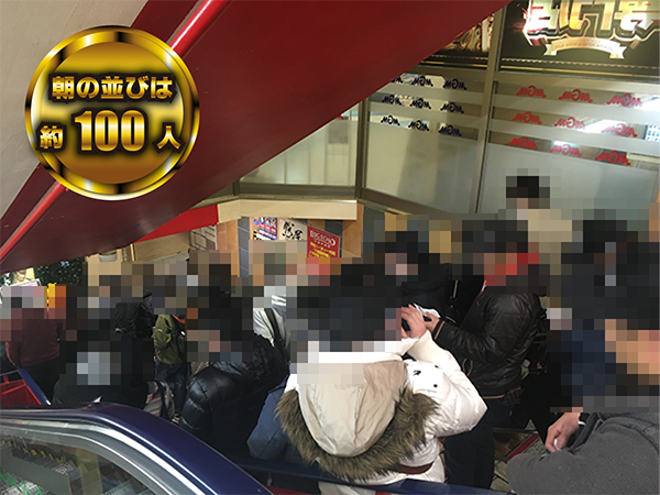 この日も大勢のパチンコ・パチスロファンが集結しており、開店の直前になると100名以上のプレイヤーが列をつくっていた。