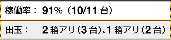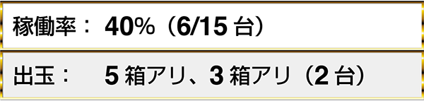 『ミリオンゴッド-神々の凱旋-』と『沖ドキ!』は半数以上のプレイヤーが持ち玉で遊技を楽しんでおり、5箱以上獲得しているシーンもみられた。