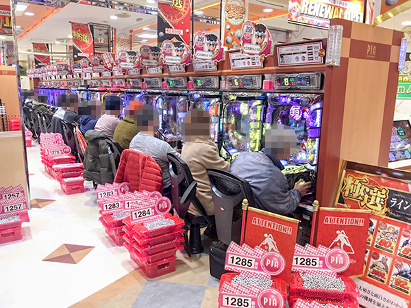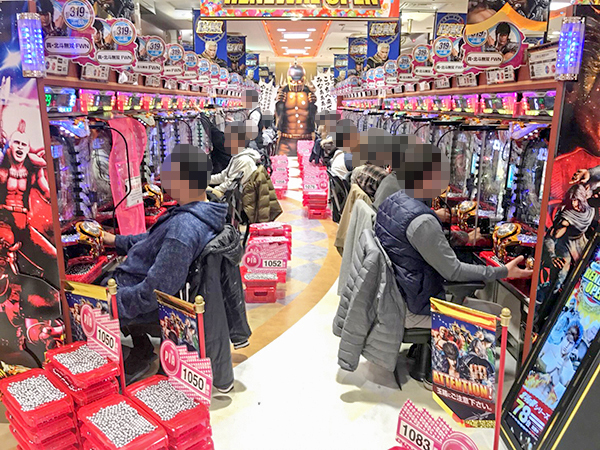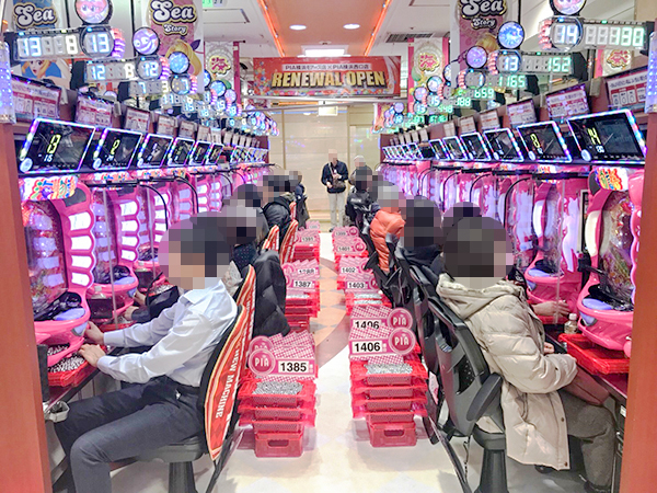 15時半ごろの4円パチンコでは、「CRスーパー海物語IN沖縄4」などの海物語シリーズ、さらに「ぱちんこCR真・北斗無双」や「CR真・花の慶次2」が高稼働。華やかな光景が広がっており、笑顔のプレイヤーを多数確認している。