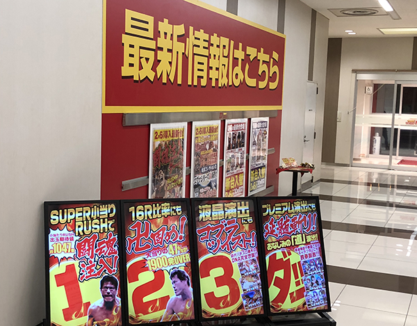 ホールの入り口には、最新機種のスペックなどが書かれた大きなボードが設置されている。より遊技を楽しめるような工夫があることも、人気を集めている要因なのだろう。