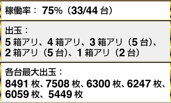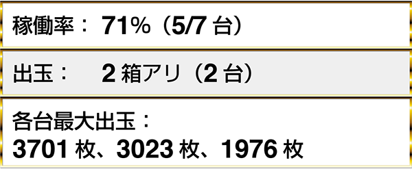 『ミリオンゴッド-神々の凱旋-』では、14名以上が持ち玉で遊技を楽しんでおり、最大で8000枚以上を獲得しているプレイヤーも確認。