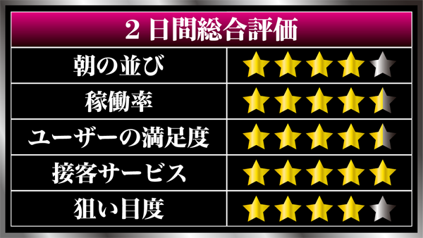 それは、魅力的なパチンコ・パチスロだけでなく、連携をしっかりととってプレイヤーを待たせることなく対応するスタッフや清潔感のあるホール内など、遊技環境も抜群に整っていたからではないだろうか。