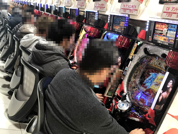 4円パチンコでは、新台「CRアントニオ猪木 打てばわかるさ! ありがとぉー!!!」が満席という状況。プレイヤーの楽しそうな表情からは、新台の魅力を存分に味わえている様子が伝わってきた。
