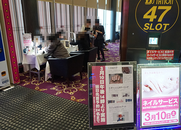 また、無料で利用できるウォーターサーバーやアメニティグッズなど、ホール内には多彩なサービスが用意されている。取材日にはネイルケアもおこなわれていた。