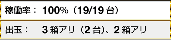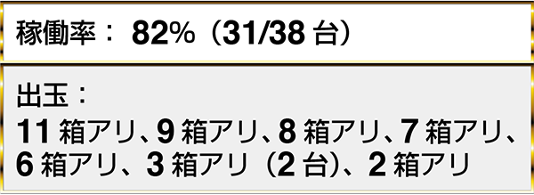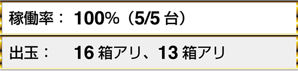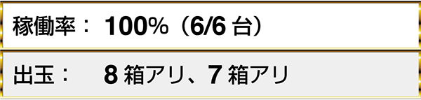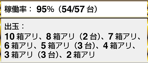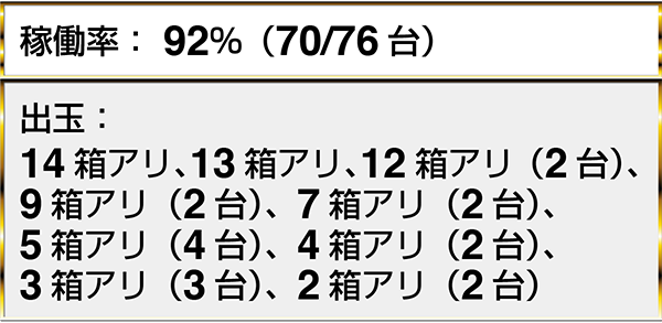 『ぱちんこCR真・北斗無双』と『CR真・花の慶次2』の稼働率が高く、どちらも90%超。2機種だけでみても、6名以上のプレイヤーが10箱以上の出玉を獲得していた。