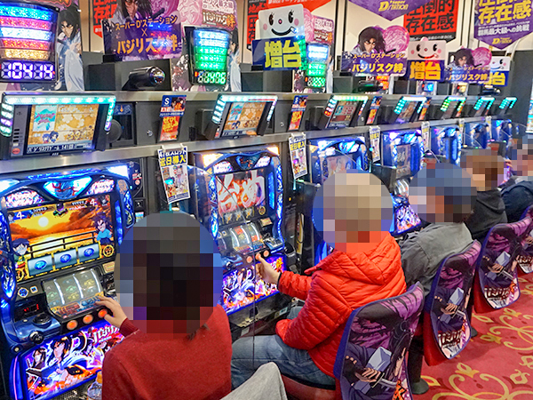 1000円/47枚パチスロを見ると、「バジリスク~甲賀忍法帖~絆」や「ミリオンゴッド-神々の凱旋-」、「沖ドキ!-30」などが活況。シマ全体に華やかな光景が広がっていた。