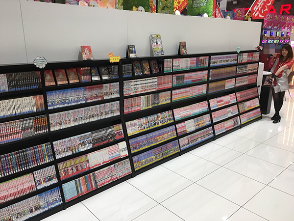 漫画喫茶のように並べられたマンガにナミエちゃんも思わずハイテンション!