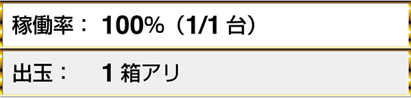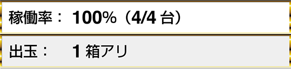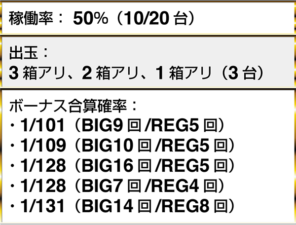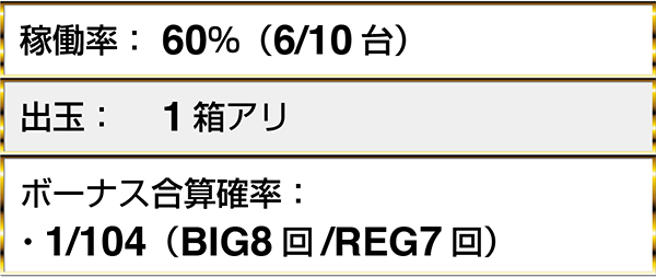 『ニューキングハナハナ-30』が朝イチから支持を集めており、午後も50%以上の稼働率をキープ。稼働している10台のうち、4台のボーナス合算確率が1/130以下であった。
