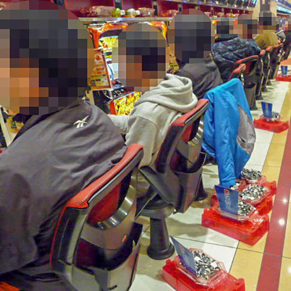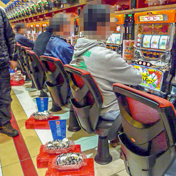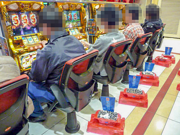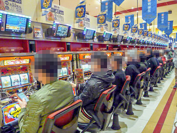 朝イチの店内を見渡すと、20円パチスロの「沖ドキ!-30」や「バジリスク~甲賀忍法帖~絆」がすぐさま満席となっていた。