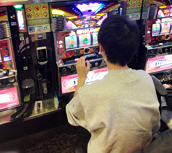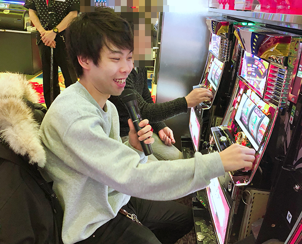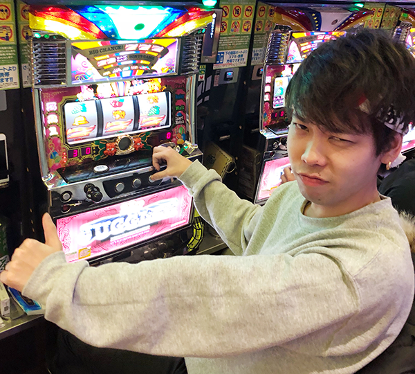 実戦機種には、前回と同様に「マイジャグラーⅢ」を選択。元気に挨拶をしたあとは、ガンガンとレバーを叩いていく!