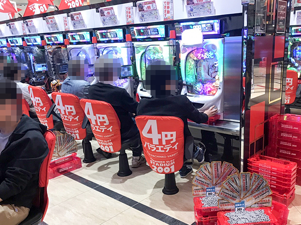 14時半過ぎに4円パチンコをチェックしてみると、「ぱちんこCR真・北斗無双」が大盛り上がり。機種性能を堪能するプレイヤーが続出し、シマ全体が活気に満ちていた。